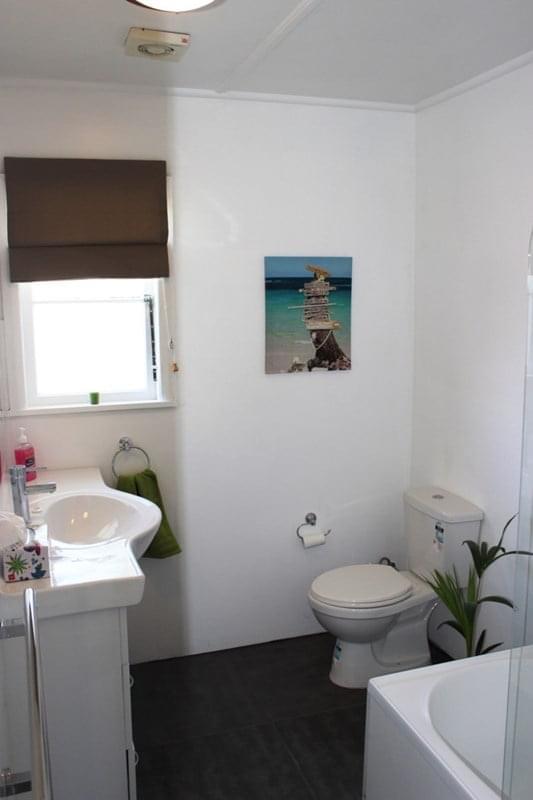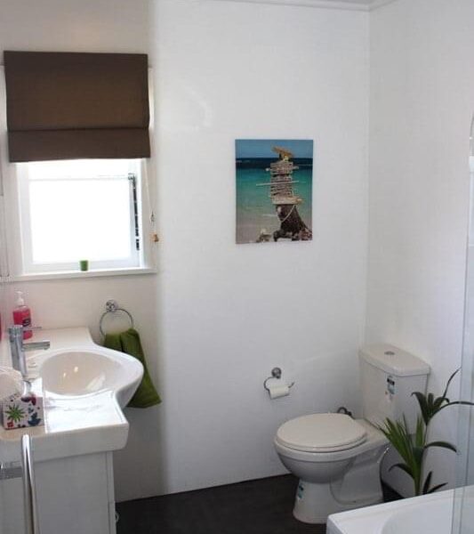 – Modern bathroom with shower over bath and 2 toilets